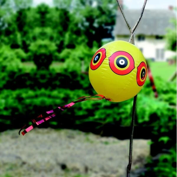 Vogelschrikbal met grote reflecterende ogen en een wapperende staart. Ideaal afschrikmiddel tegen overlast van vogels in boomgaarden of gewassen. Hang de opgeblazen ballon aan een paal of in een boom en schrik de vogels op die manier af.